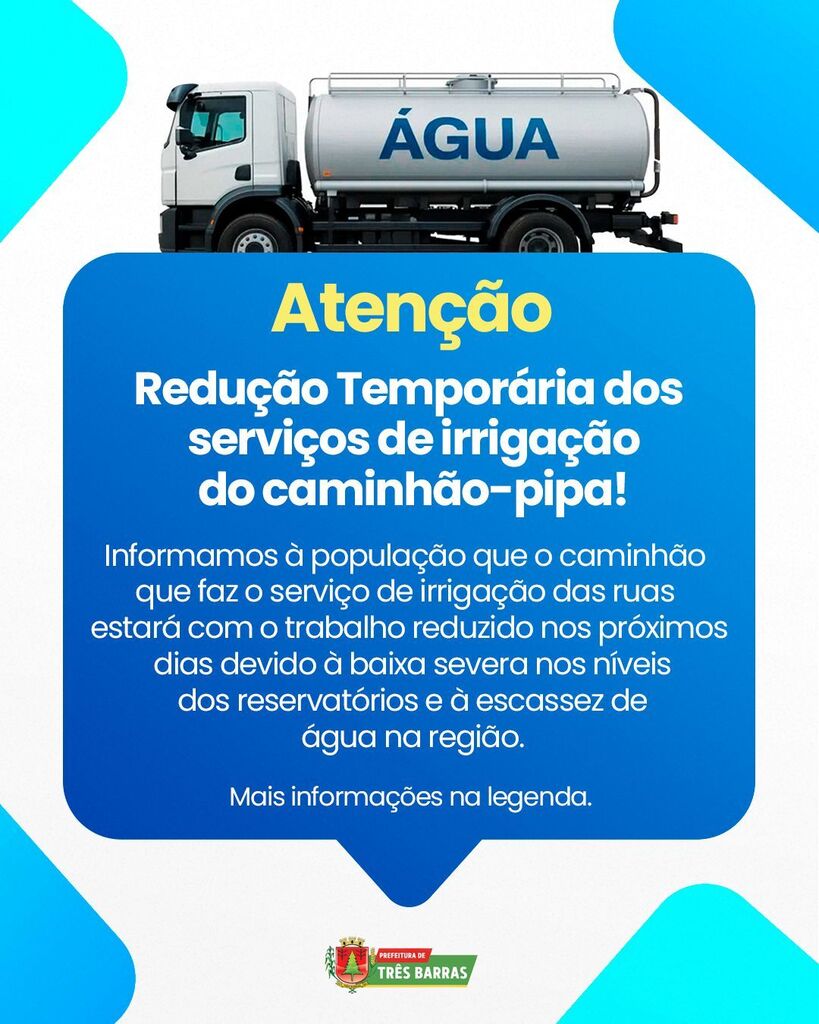 Informamos à população que o caminhão que faz o serviço de irrigação das ruas estará com o trabalho reduzido nos próximos dias devido à baixa severa nos níveis dos reservatórios e à escassez de água na região.
