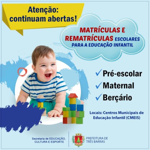 A secretaria de Educação, Cultura e Esporte informa que permanecem abertas as matrículas e rematrículas para os Centros Municipais de Educação Infantil (CMEIS) de Três Barras.