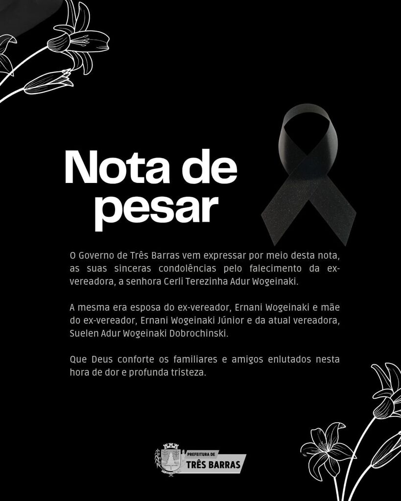 O Governo de Três Barras vem expressar por meio desta nota, as suas sinceras condolências pelo falecimento da ex-vereadora, a senhora Cerli Terezinha Adur Wogeinaki.