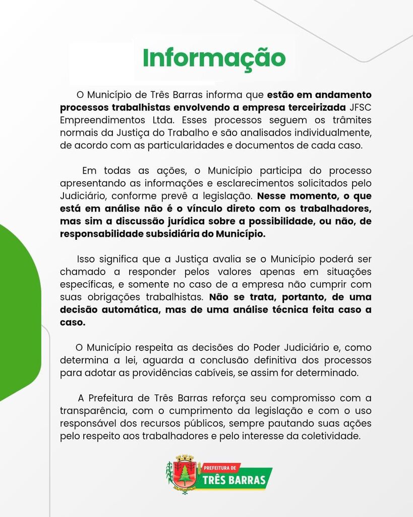Prefeitura de Três Barras publica comunicado sobre empresa terceirizada JFSC envolvida em processos trabalhistas