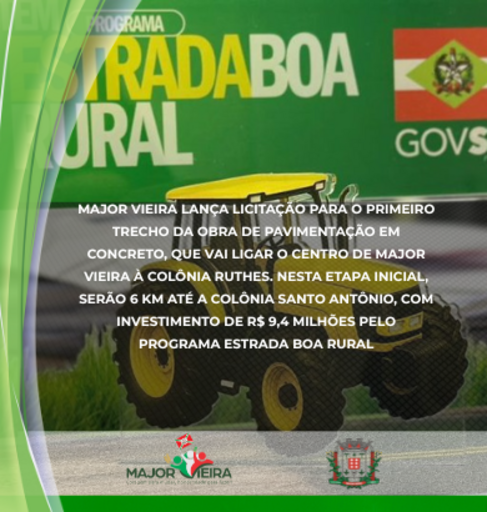 A Prefeitura de Major Vieira publicou nesta sexta feira dia 22 de janeiro o Edital nº 002/2026, na modalidade Concorrência Eletrônica, para a contratação de empresa especializada na pavimentação de 6 quilômetros em concreto na Estrada Geral Rio Novo – Trecho 1.