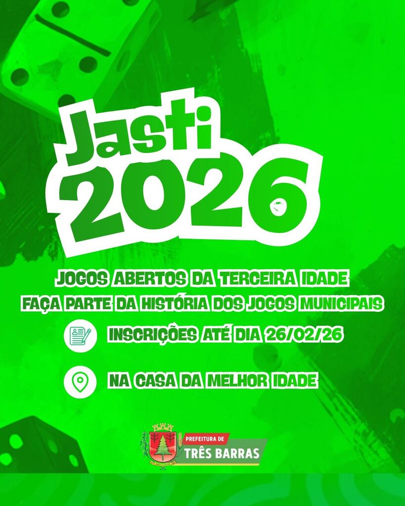 Já estão abertas as inscrições para os Jogos Abertos da Melhor Idade (JASTI) fase municipal. Haverão várias modalidades, como por exemplo: Truco, Dominó e Canastra (ambas masculino e feminino) com a realização da Bocha (apenas masculino).As inscrições seguem até o dia 26 de fevereiro na Casa da Melhor Idade no distrito de São Cristóvão e no Ginásio de Esportes Ione Cyríaco de Souza.Os jogos começam no dia 27.