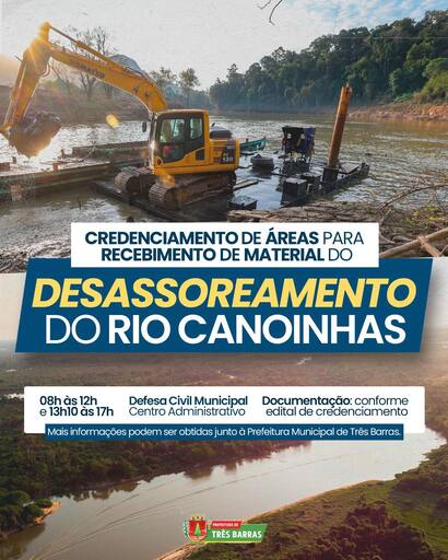 O Município de Três Barras informa que está aberto o credenciamento de proprietários de imóveis interessados em disponibilizar áreas para recebimento de material proveniente do desassoreamento do Rio Canoinhas, no trecho que circunda o Distrito de São Cristóvão. O material é composto por sedimentos naturais (areia, silte e argila), previamente triados e não contaminados, e será destinado a áreas previamente vistoriadas e aprovadas pela equipe técnica municipal, dentro de um raio máximo de 15 km da área de intervenção.Os interessados deverão protocolar a documentação junto à Defesa Civil Municipal, no Centro Administrativo, durante o horário de expediente, conforme requisitos estabelecidos no edital e termo de referência.A seleção das áreas seguirá ordem cronológica de inscrição e análise técnica, não havendo limite de credenciados.