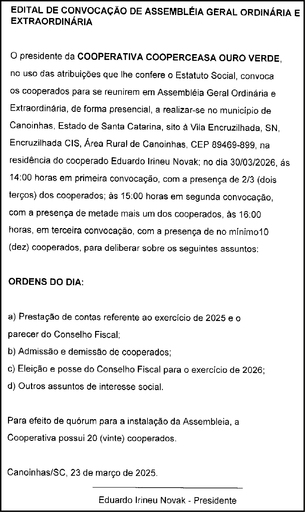Edital de convocação de assembléia geral ordinário e extraordinária - COOPERATIVA COOPERCEASA OURO VERDE