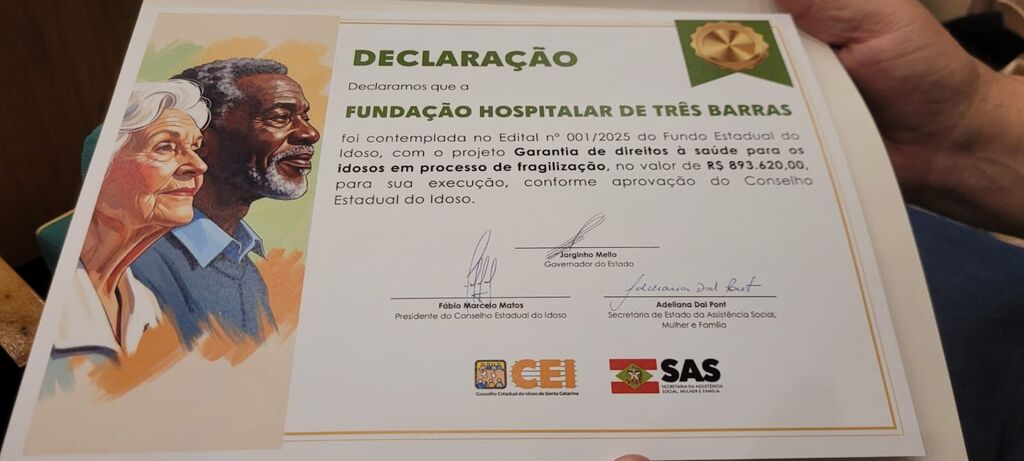 Na última terça-feira, 02 de dezembro de 2025, a Fundação Hospitalar de Três Barras foi oficialmente contemplada com o valor de R$ 893.620,00 por meio do edital do Fundo Estadual do Idoso (FEI). O recurso será destinado ao custeio de exames, aquisição de medicamentos, além da compra de móveis, aparelhos e demais equipamentos essenciais para a melhoria do atendimento à população idosa do município.O projeto que garantiu a captação deste importante investimento foi desenvolvido pela Fundação Hospitalar e o apoio do Conselho Municipal do Idoso, reforçando o compromisso das instituições com o fortalecimento das políticas públicas voltadas à saúde e ao bem-estar da pessoa idosa.Durante o cerimonial de celebração da parceria com órgãos públicos e organizações da sociedade civil, estiveram presentes o Coordenador da Fazenda e atual Presidente do Conselho Municipal do Idoso, Sr. Evandro Maçaneiro, e a Diretora Administrativa da Fundação Hospitalar de Três Barras, Sra. Luciane Tizzato Weinfurter, que representaram o município no evento.A conquista marca um avanço significativo para a rede de atendimento à pessoa idosa, possibilitando melhorias estruturais e qualificação dos serviços oferecidos pela Fundação Hospitalar de Três Barras.