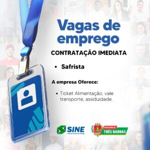 O Posto de Atendimento do Sine de Três Barras informa que há novas vagas de emprego no município. Os interessados devem comparecer até o SINE, localizado na Avenida José Nunes Cavalheiro, 773 – Bairro Zilda Pacheco (Argentina). Ambas as vagas oferecem Ticket Alimentação.