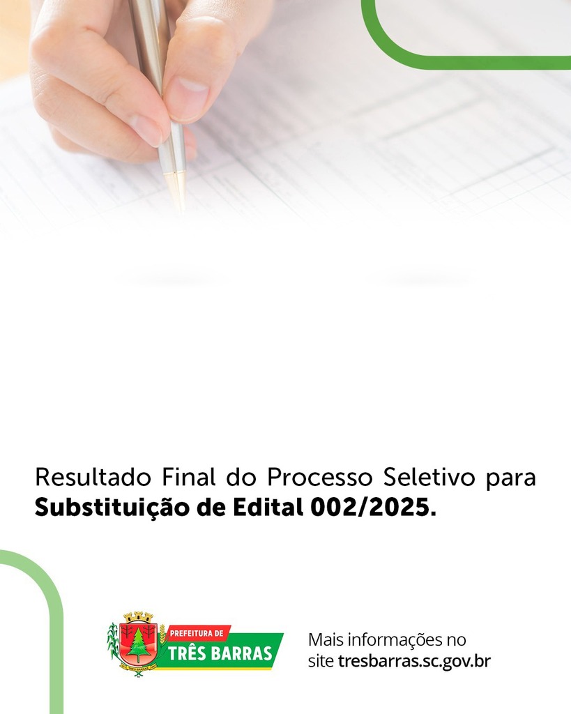 A Prefeitura de Três Barras divulgou na tarde desta terça-feira, 07, os resultados finais do Concurso para Emprego Público e do Processo Seletivo para Substituição do Edital (002/2025).