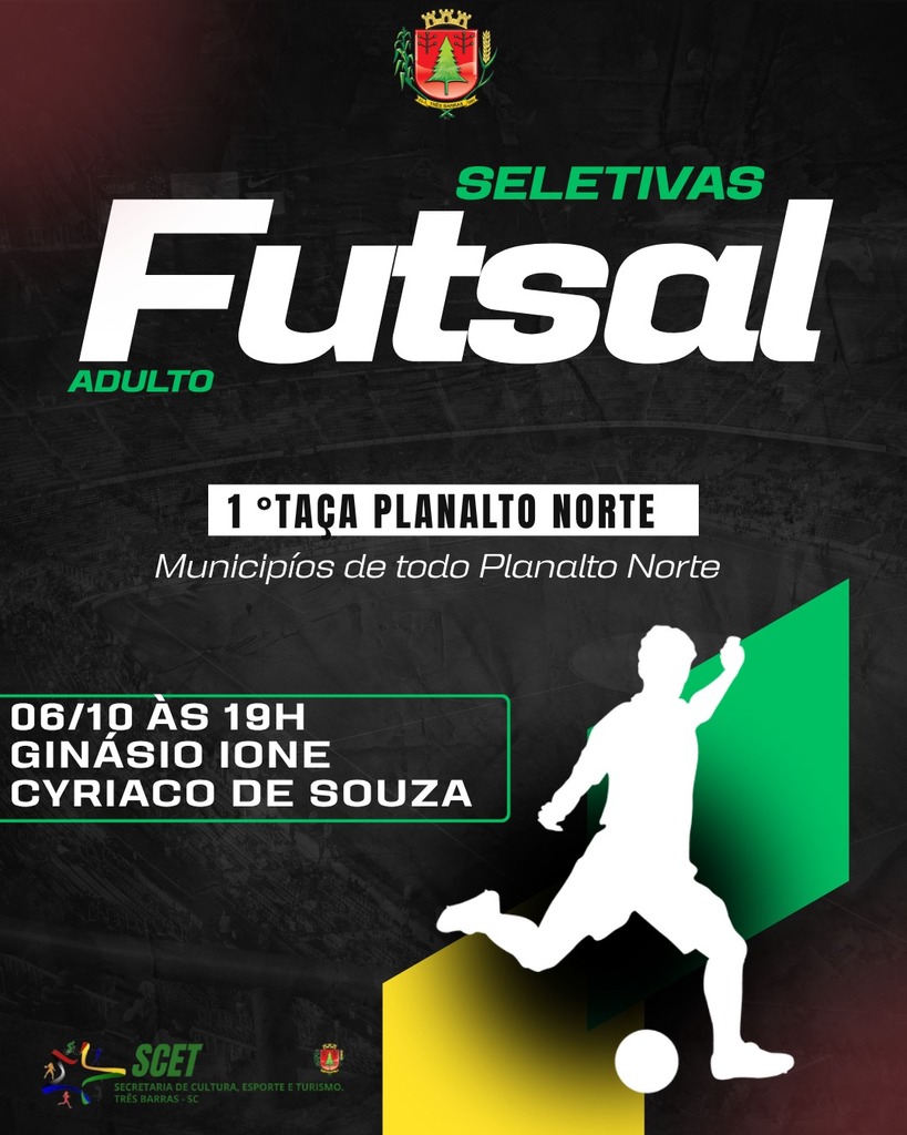Hoje segunda-feira, 06 as 19 horas acontece no Ginásio de Esportes Ione Cyríaco de Souza, em Três Barras, as seletivas para o Futsal adulto.